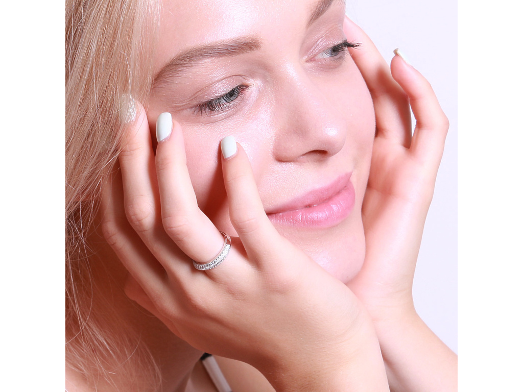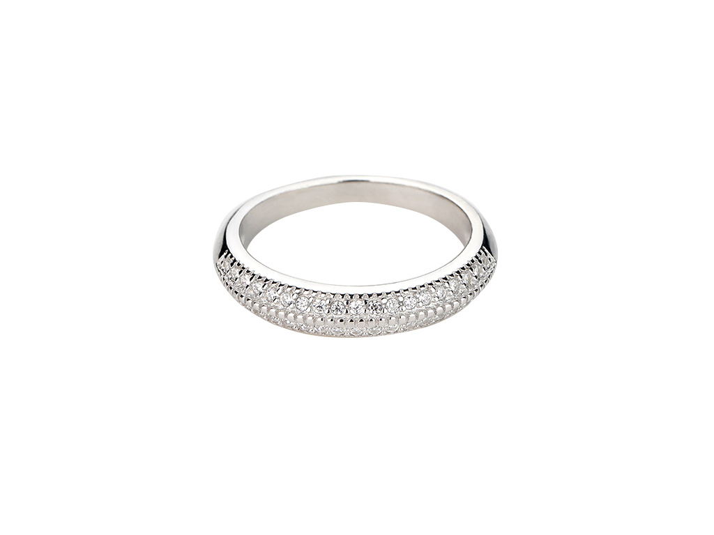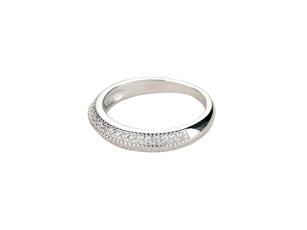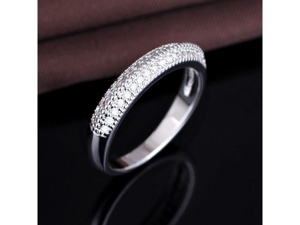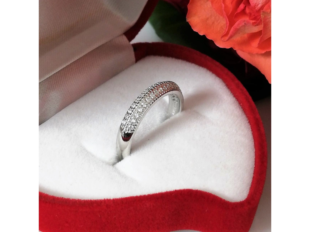 Prsteň je do polovice posiaty drobnými čírymi zirkónmi.