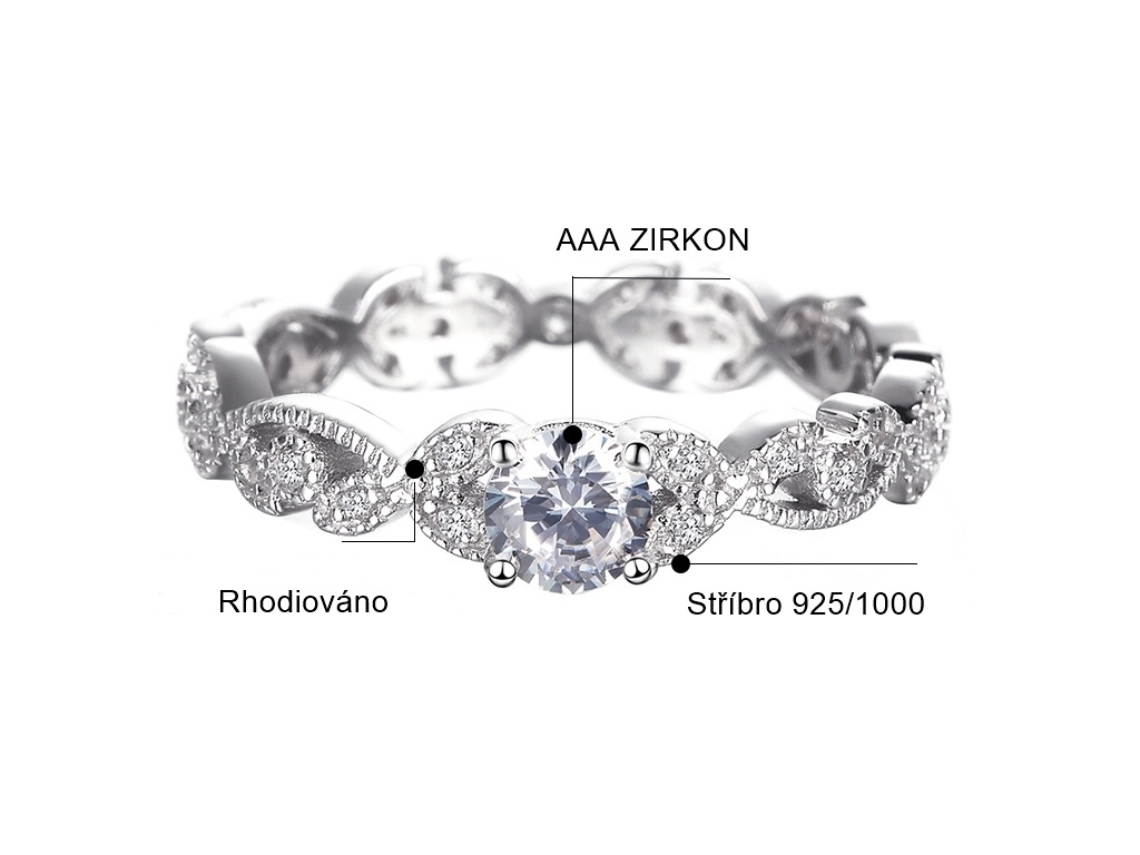 Číry kubický zirkón ako hlavný kameň a množstvo drobných zirkónov aj po obvode prsteňa.