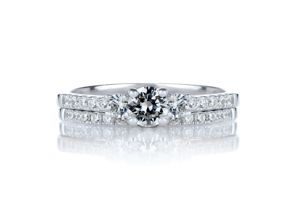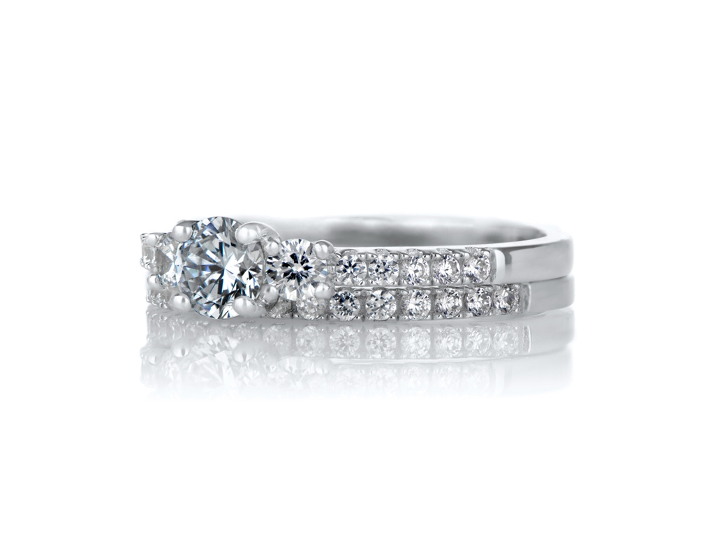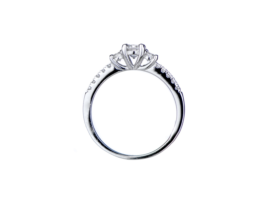 Potom navlečte prsteň s tromi dominantnými zirkónmi a ďalšími piatimi zirkónmi, ktoré sú zasadené z každej strany.