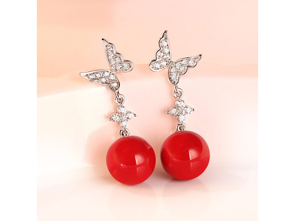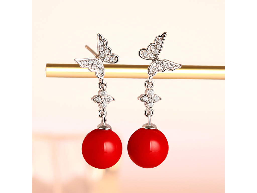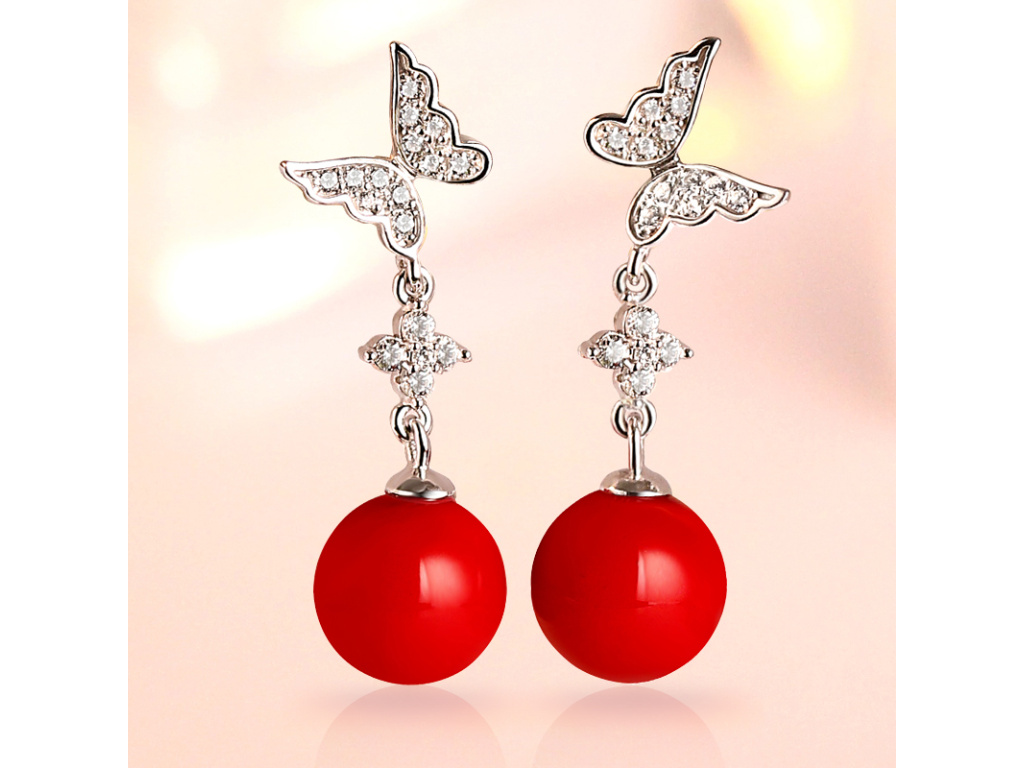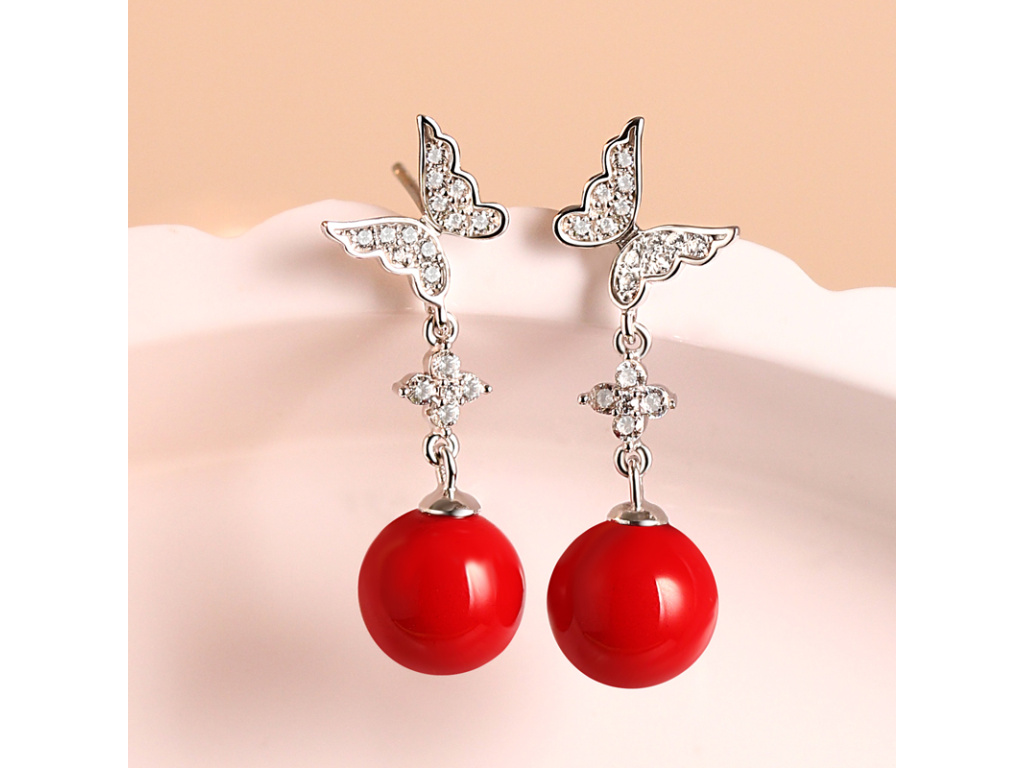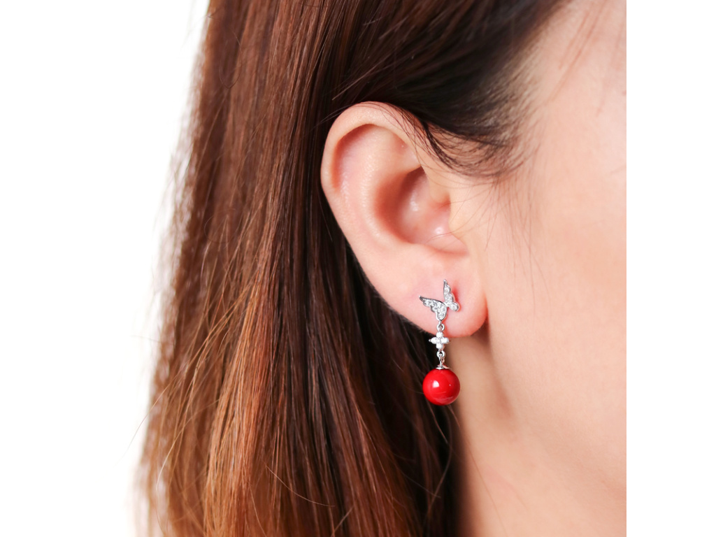 4590 Strieborné náušnice MOTÝĽ s červenou perlou Ag 925; ≤2,8 g.