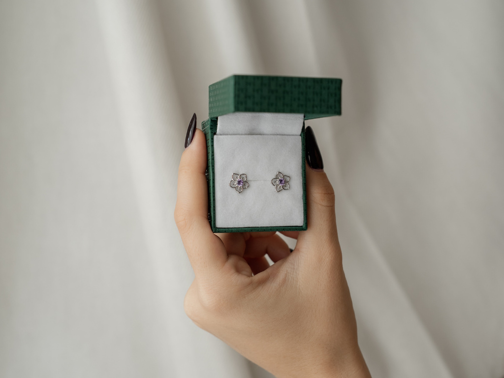 - Krásne a kvalitné strieborné náušnice s fialovým zirkónom v strede.