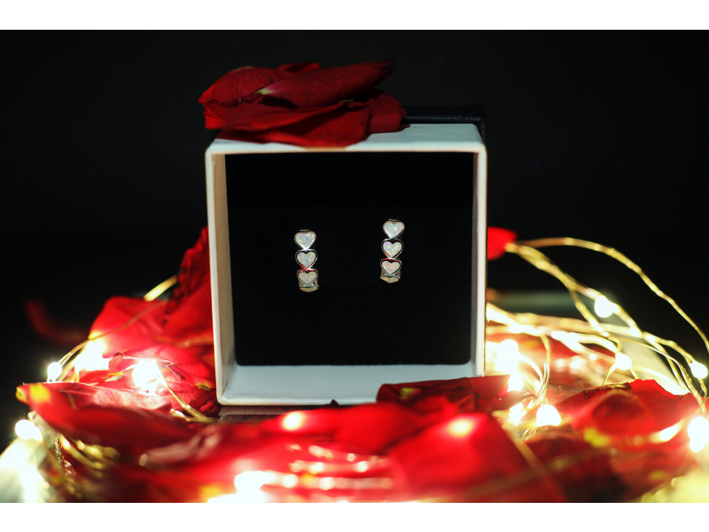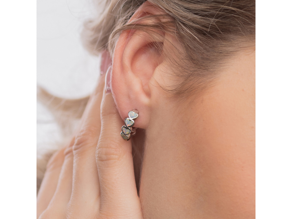 Biely laboratórny opál vsadený do srdiečok z prednej strany.