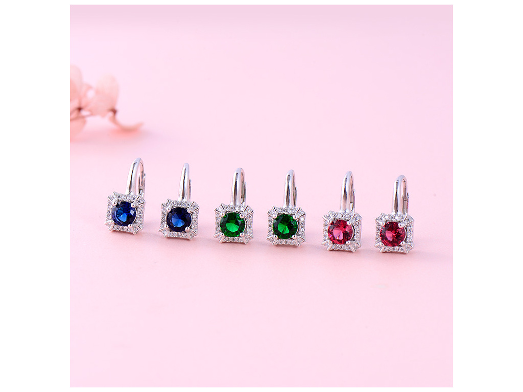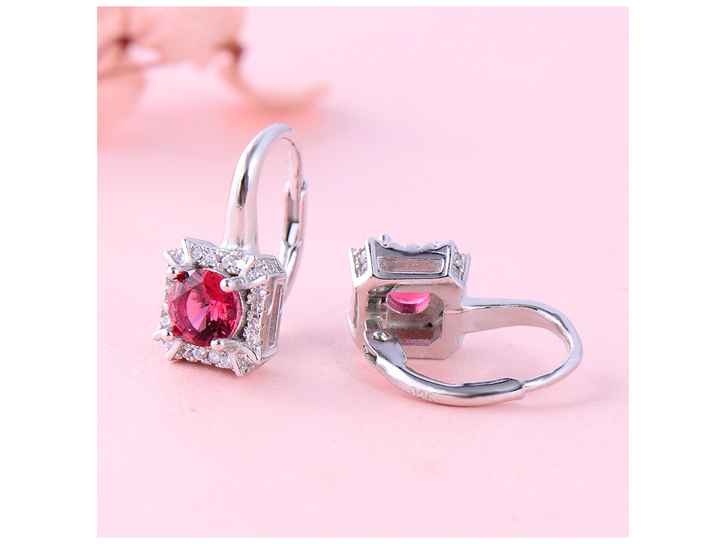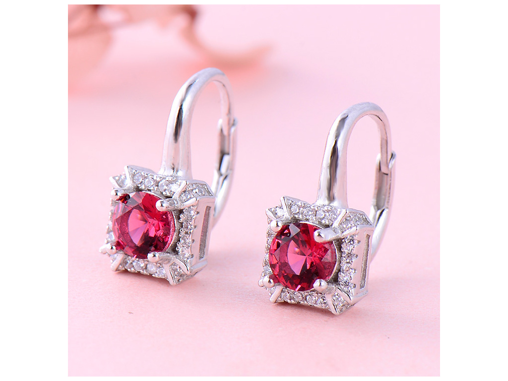 Strieborné náušnice s červeným kryštálom a čírymi zirkónmi po obvode.