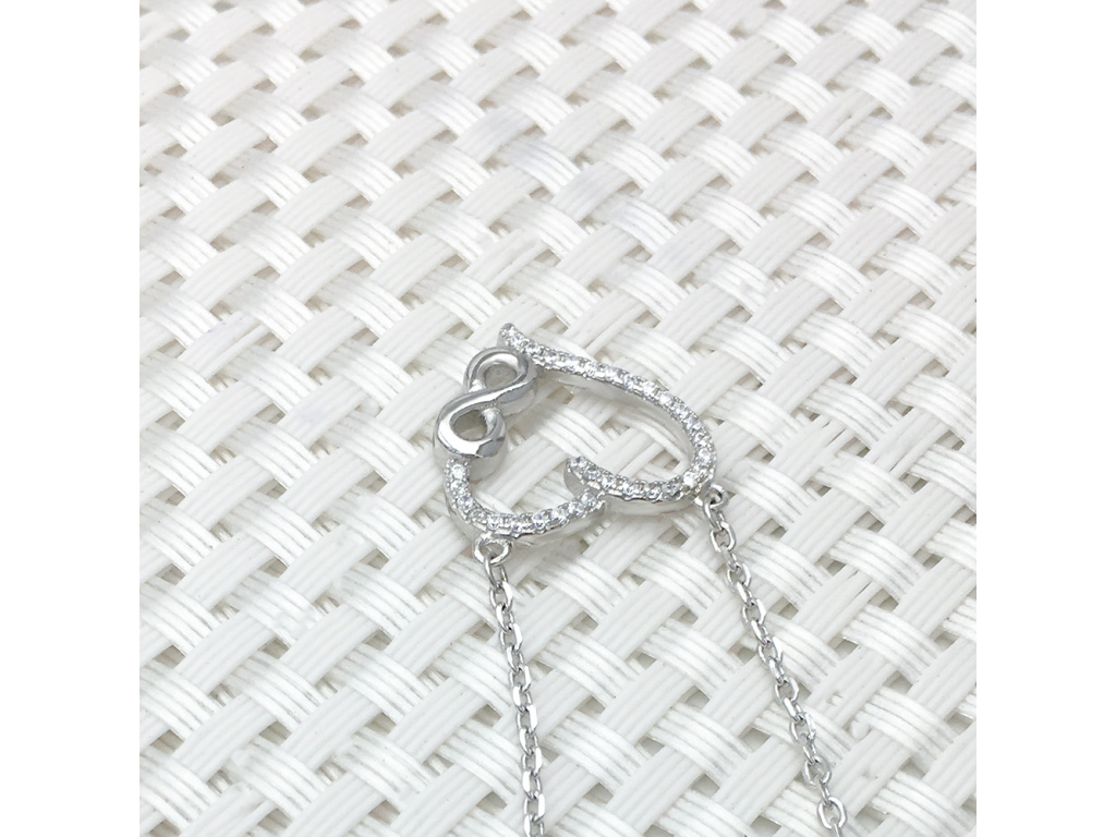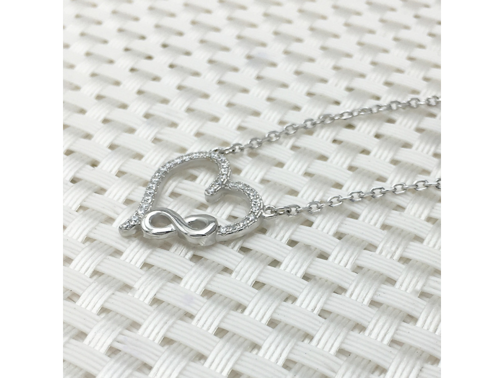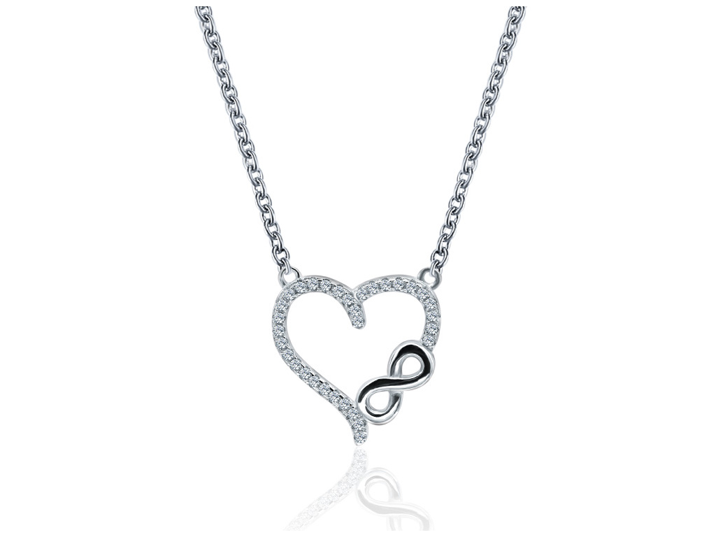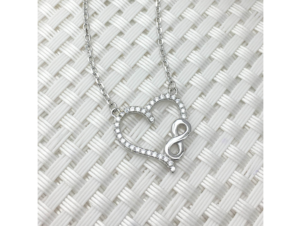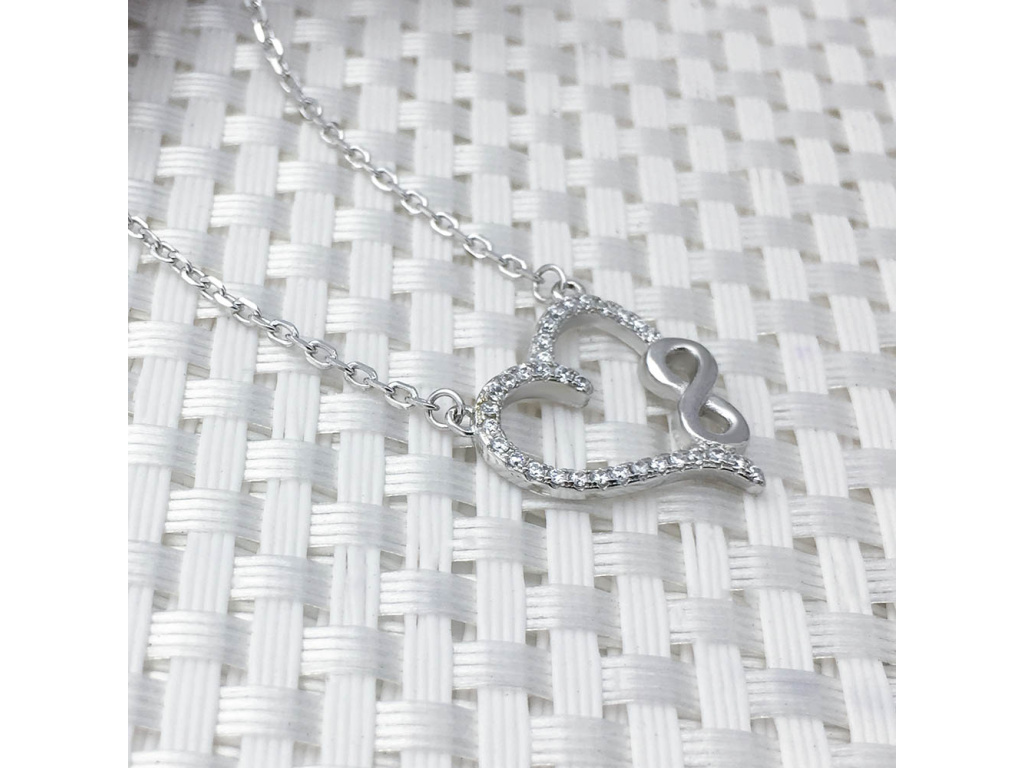 Strieborný náhrdelník so symbolom NEKONEČNO a so srdiečkom, ktoré je posiate čírymi zirkónmi.