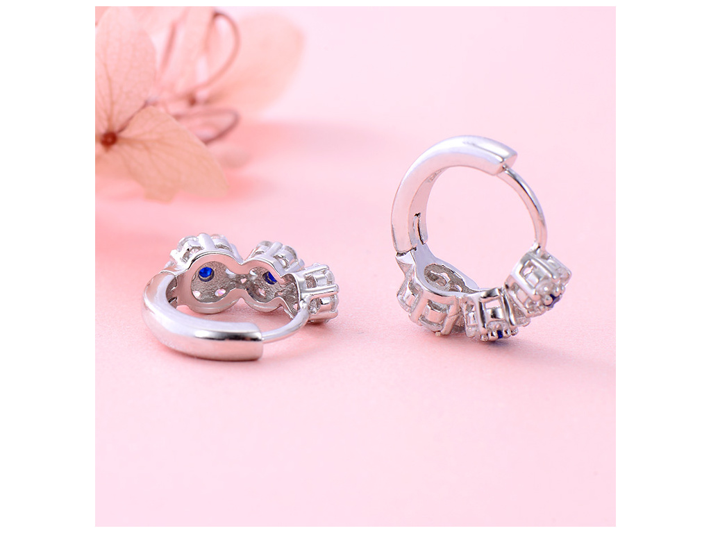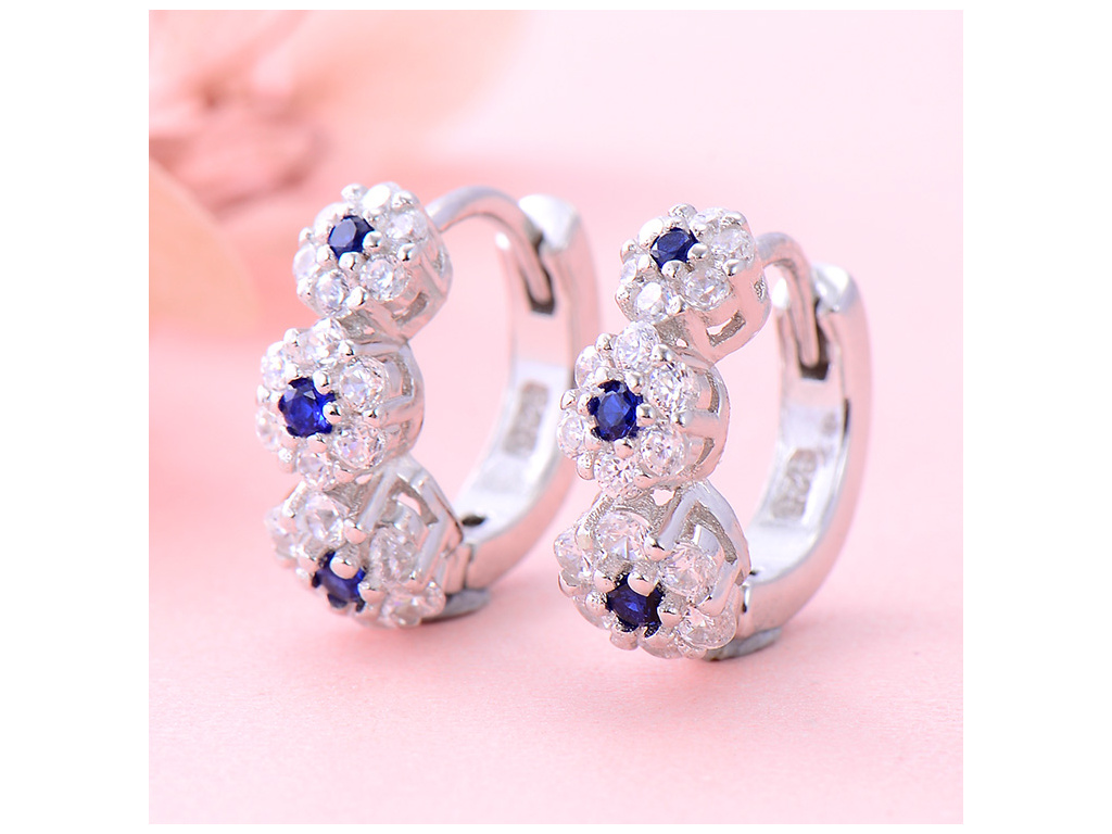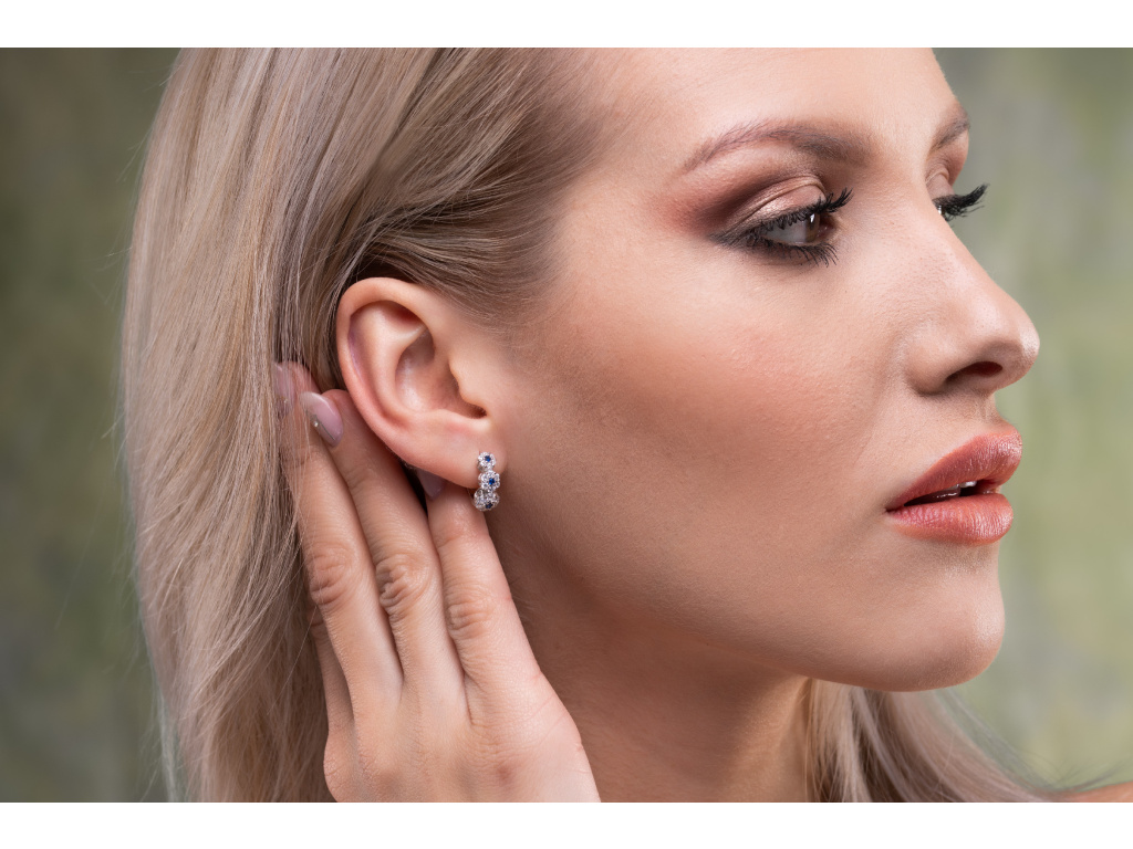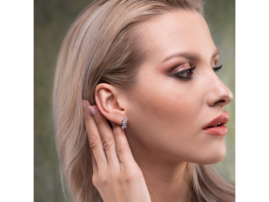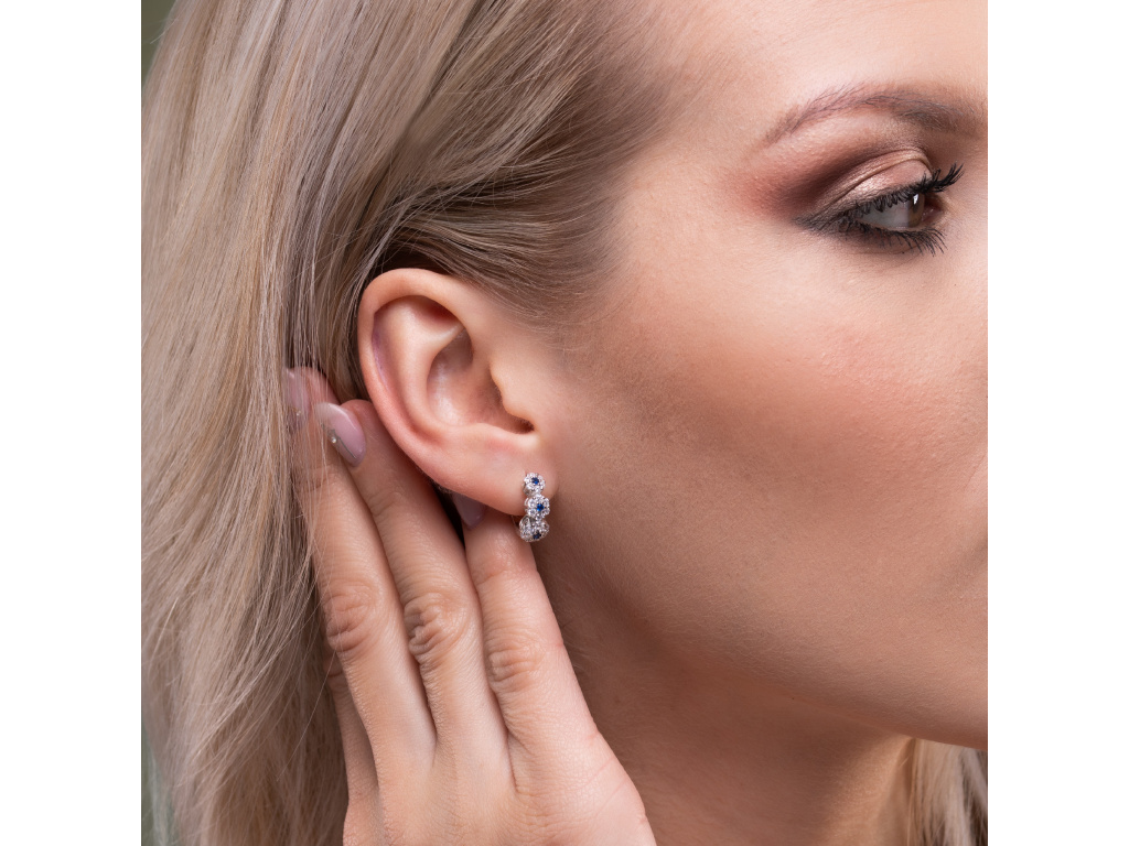 Strieborné náušnice s tromi tmavomodrými zirkónmi a mnohými čírymi.