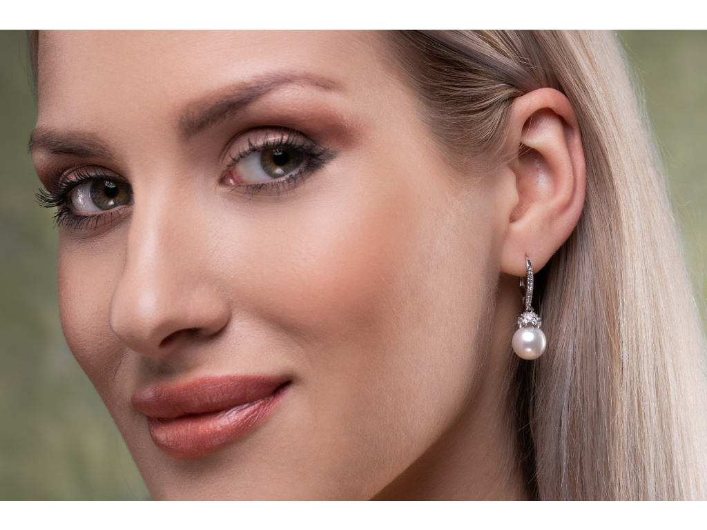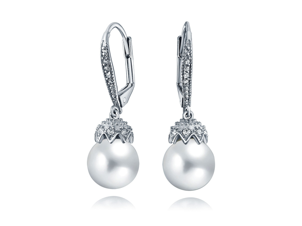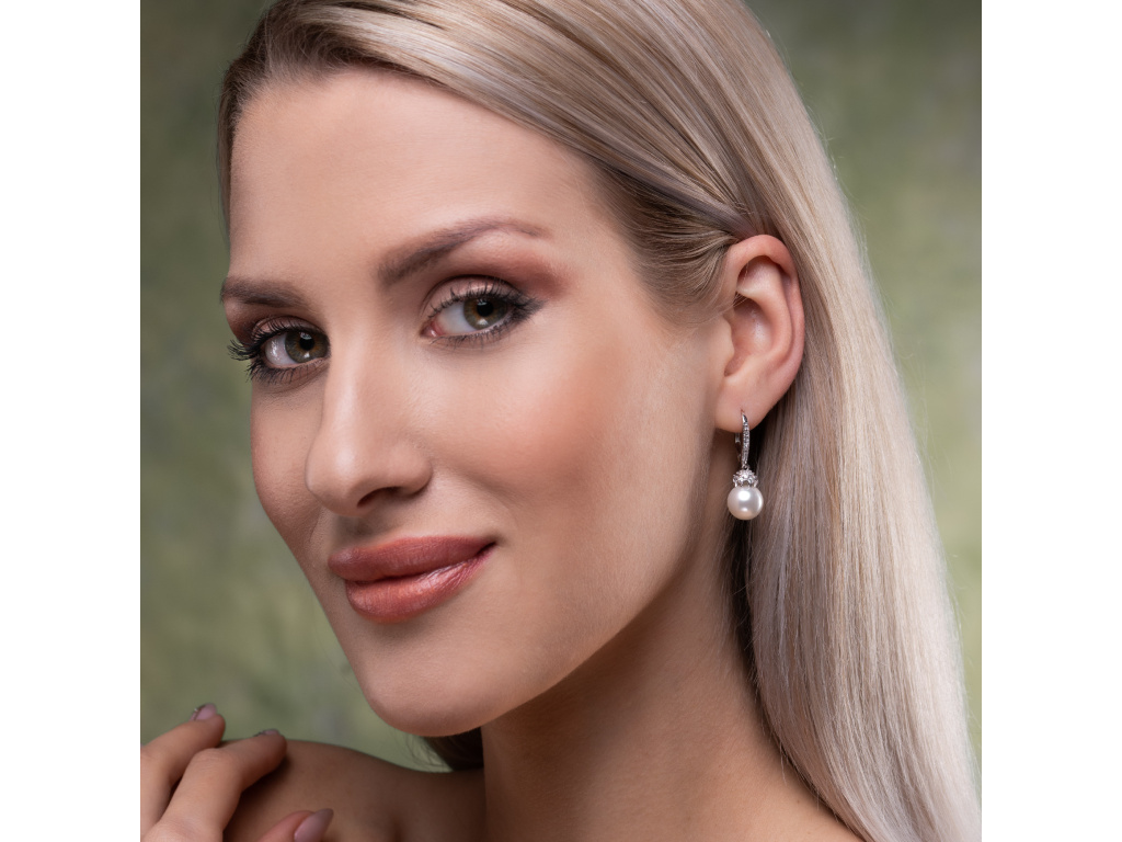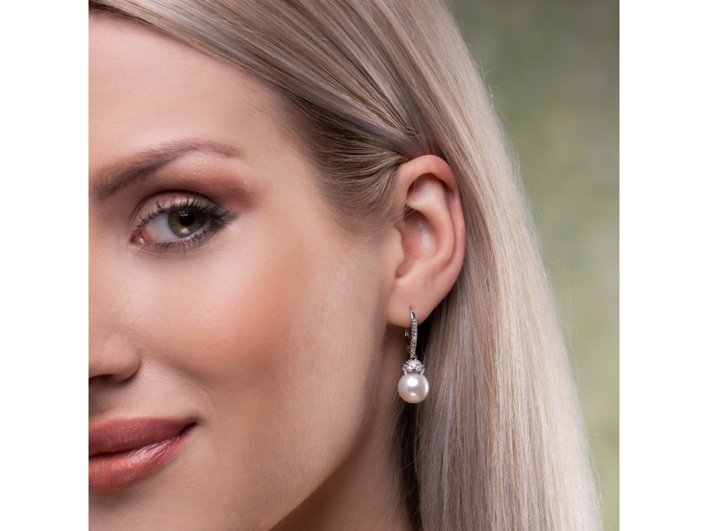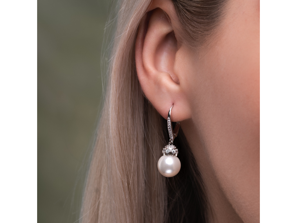 Nádherné dizajnové visiace strieborné náušnice s perlou a zirkónmi.