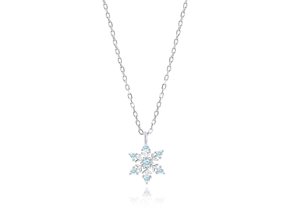 Ródiovaný strieborný náhrdelník s motívom snehovej vločky s modrými zirkónmi.
