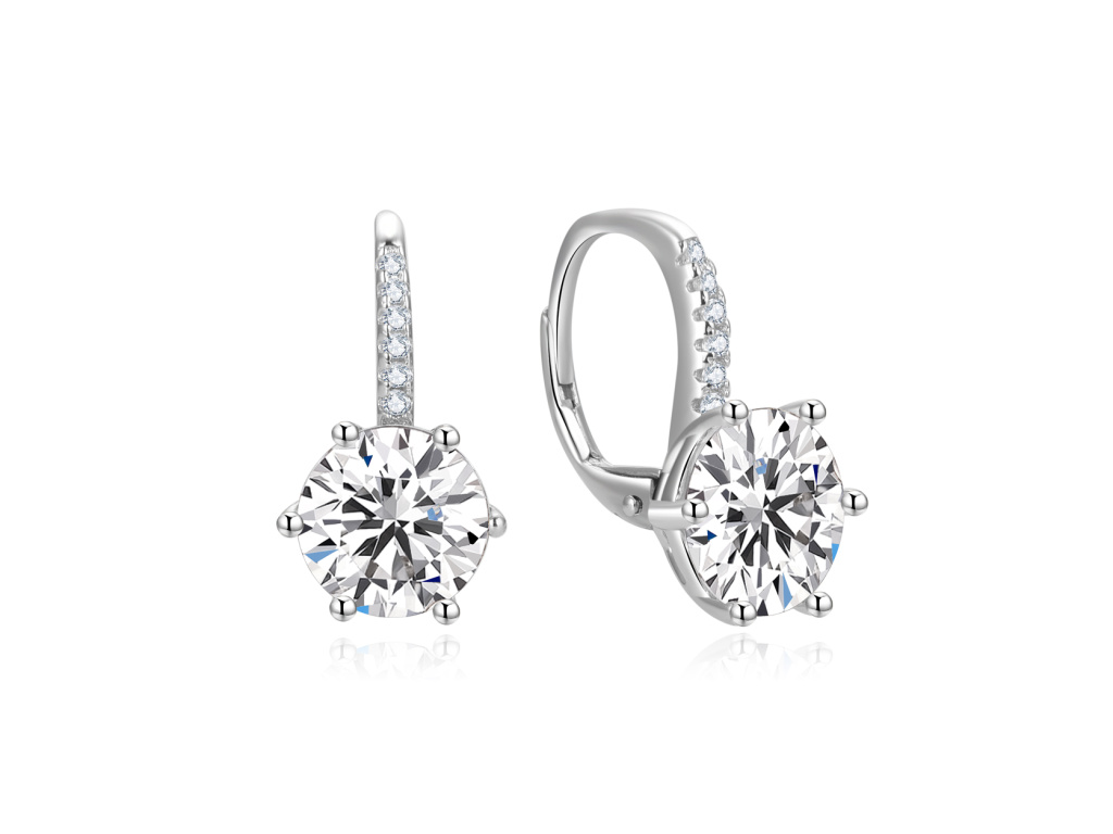 Strieborné náušnice s veľkým čírym zirkónom uprostred a menšími čírymi zirkónmi na zapínanie.