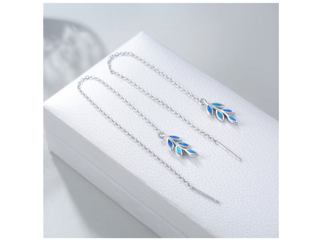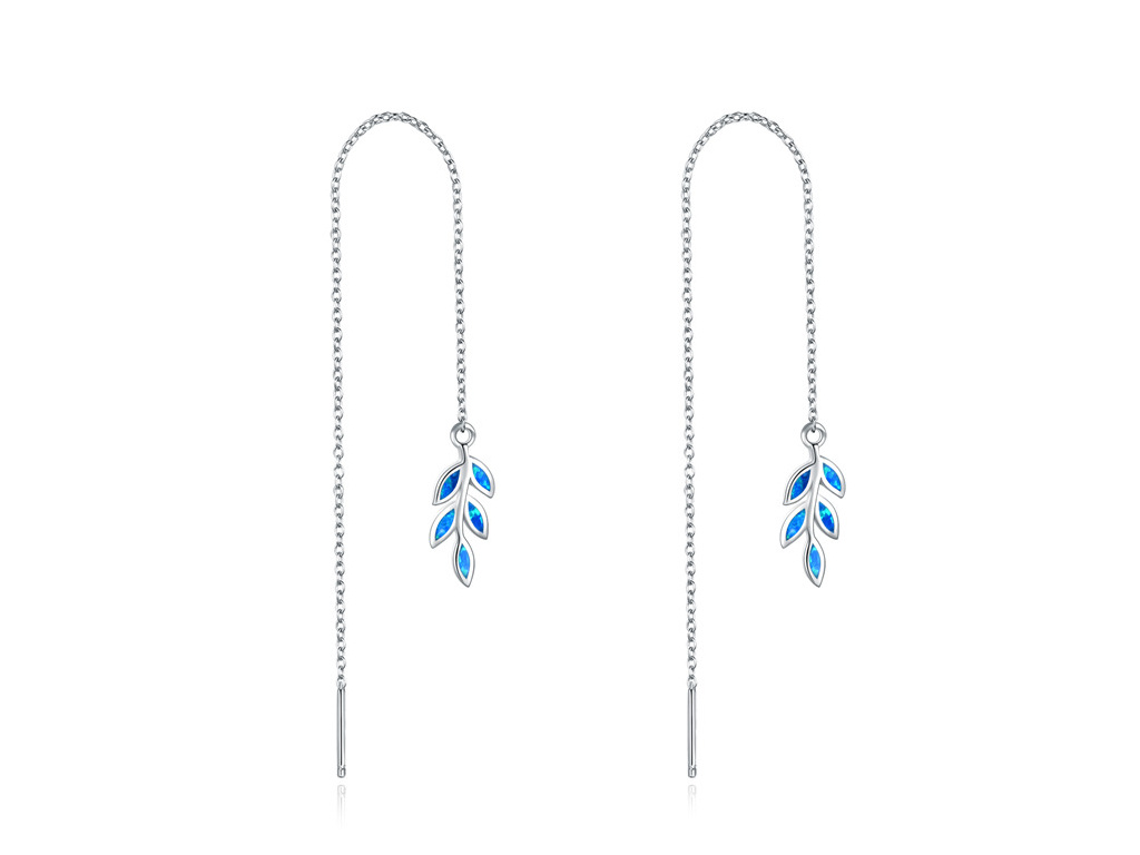 Prevliekacie retiazkové náušnice s listami, ktoré sú ozdobené modrým opálom.
