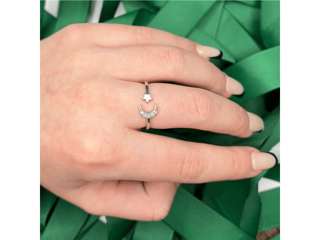 Číre zirkóny v kombinácii s decentným bielym opálom. Motív hviezdičky s mesiacom môže vyvolávať krásne spomienky na prežité večery, ktoré si chcete uchovať vo svojom srdci. Strieborný prsteň VEČERNICE je možné nastaviť podľa potreby, ideálna veľkosť je 6.