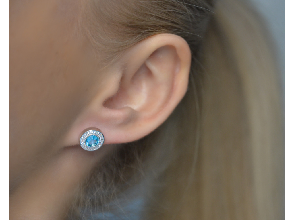 Guľaté trblietavé náušnice so svetlo modrým zirkónom.