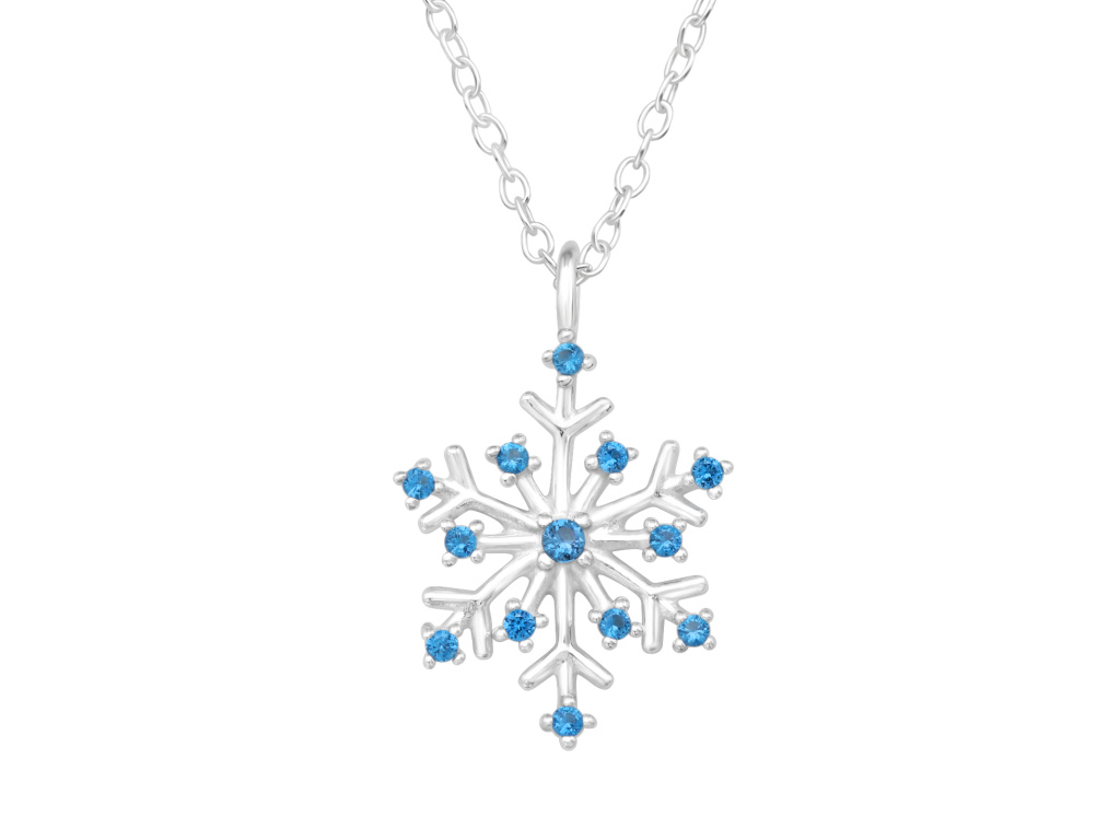 Strieborný náhrdelník s motívom snehovej vločky s modrými zirkónmi.
