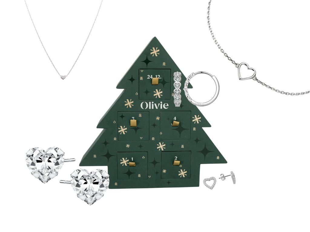 Vianočný kalendár OLIVIE SRDCE je päť kapitol nehy a radosti. Motív srdiečka sprevádza každé otvorenie každej zásuvky – od jemných napichovacích náušníc až po elegantný náhrdelník a náramok. Každá nedeľa je malý sviatok svetla, lásky a trblietania.