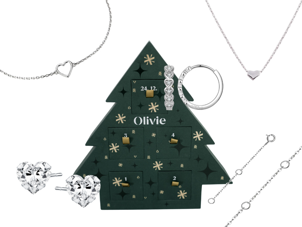 Adventný kalendár OLIVIE SRDCE rozpráva päť jemných kapitol o láske. Každé otvorenie šuplíčka pridá ďalšiu iskru – od decentných kôstok až po ikonické srdiečko na retiazke. Tón je čistý, moderný a nežne ženský.