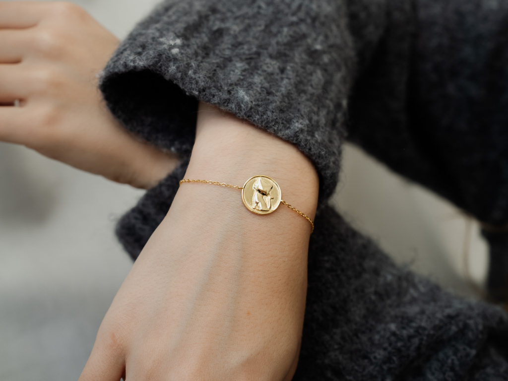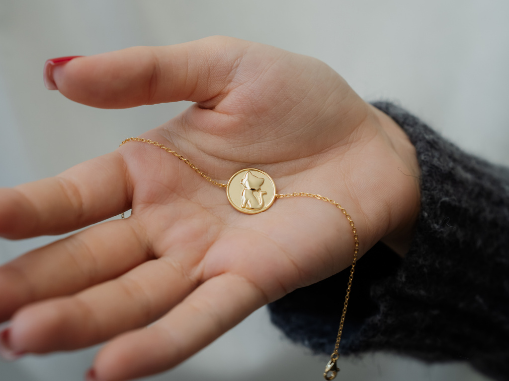 Strieborný náramok s motívom roztomilej mačky.