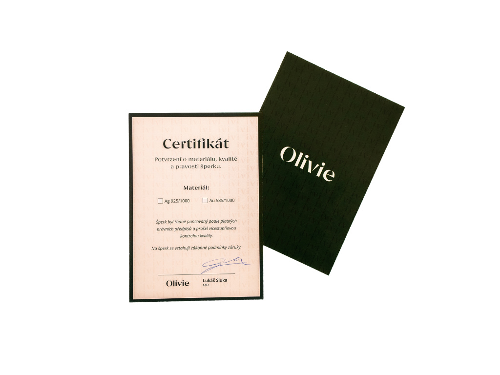 Keď darujete alebo si kupujete šperk, nejde len o krásu samotnú, ale aj o pocit, že v ruke držíte niečo skutočne poctivé. Certifikát pravosti Olivie tento pocit potvrdzuje. Obsahuje informácie o materiáli a rýdzosti šperku, ktorý bol podľa platných právnych predpisov riadne puncovaný a prešiel starostlivou viacstupňovou kontrolou kvality.