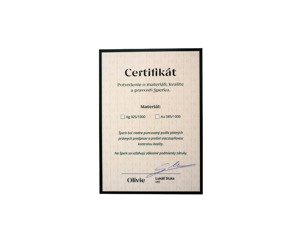 Certifikát pravosti Olivie je malý dokument s veľkým významom. Je to uistenie, že držíte v rukách šperk, za ktorým si pevne stojíme.