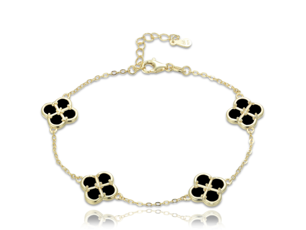 - Jemný náramok so štvorlístkovými príveskami zdobenými čiernou perleťou – symbolom elegancie a osobného významu.