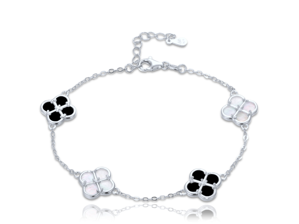 - Jemný náramok so štvorlístkovými príveskami zdobenými bielou a čiernou perleťou – symbolom elegancie a osobného významu.
