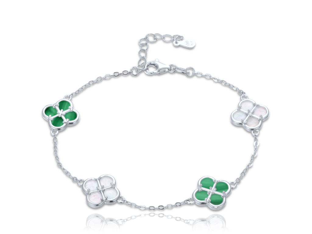 Stříbrný náramek čtyřlístky s bílou perletí a malachitem TALIS Ag 925; ≤4,20g.