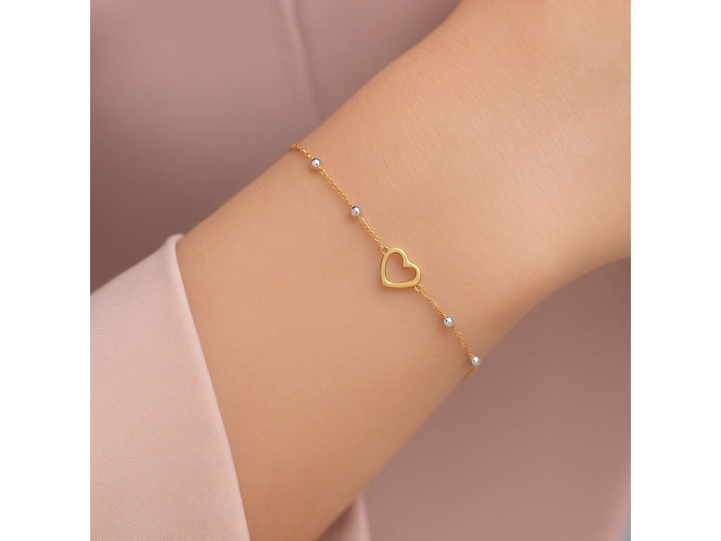 MINET Zlatý náramek srdíčko a kuličky v kombinaci bílého a žlutého zlata Au 585/1000